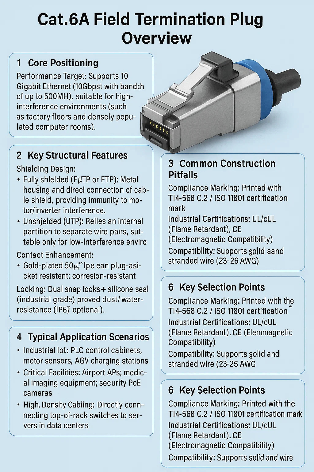 | Caracteristică | Priză de terminare a câmpului Cat.6A | Priză de sertizare standard Cat.6 | Impact practic |