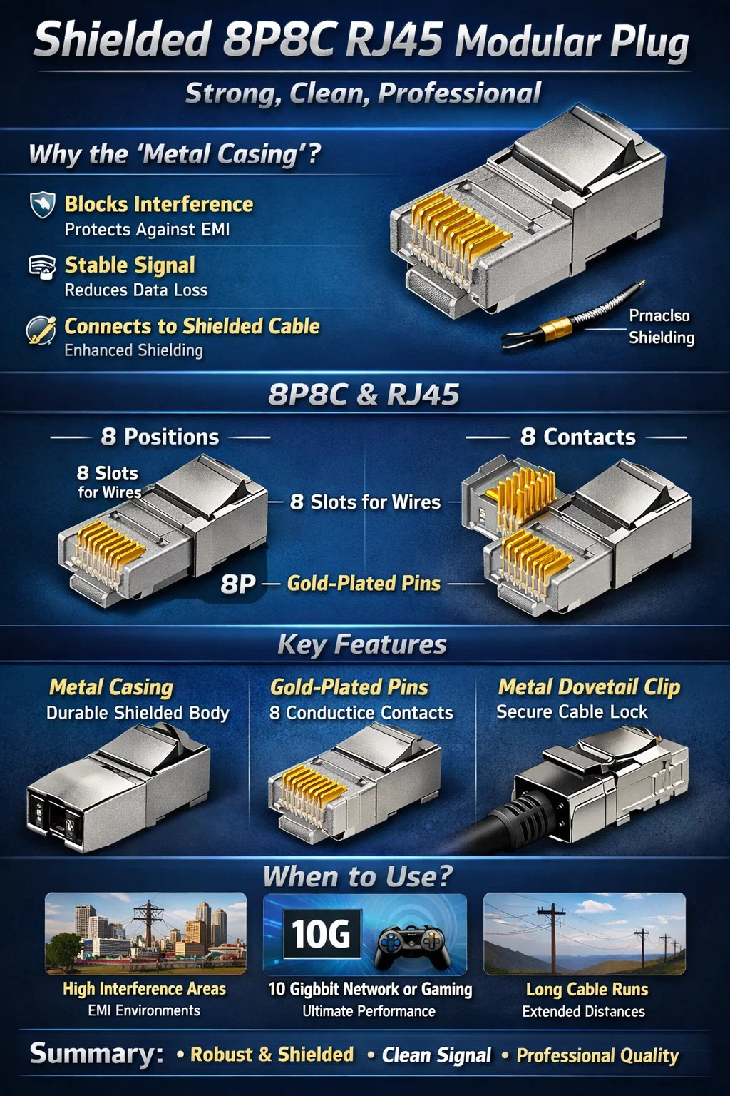 Blocarea interferenței: „Shielded” din nume înseamnă ecranare. Această carcasă metalică acționează ca o vestă antiglonț pentru conectorul cablului de rețea, special concepută pentru a bloca interferențele electromagnetice externe (cum ar fi semnalele parazite de la firele din apropiere sau zgomotul de la motoare mari).